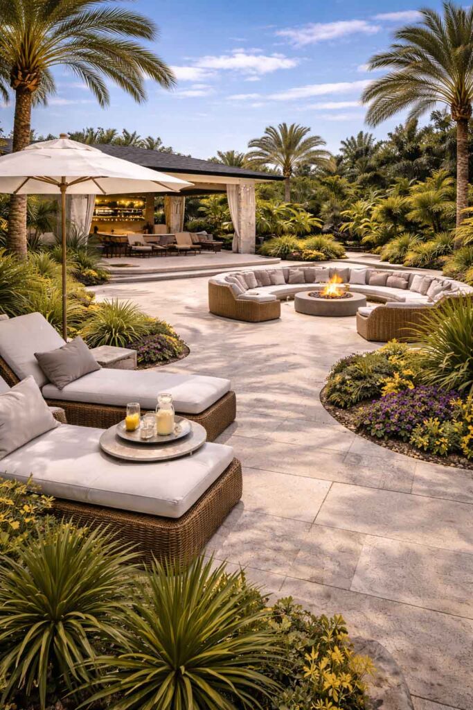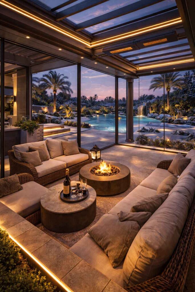 Los elementos sensoriales elevan el lujo. Una lámina de agua, una fuente lineal o una pequeña cascada aportan sonido y frescor. Y el fuego vuelve con fuerza: mesas brasero, chimeneas exteriores de diseño y líneas de fuego a gas integradas en bancadas. En villas, estos recursos convierten el patio en un espacio emocional, no solo funcional.